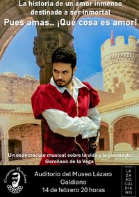 Comenzamos en 2019 la producción y gira de esta obra, única en su género: teatro clásico sobre textos de Garcilaso de la Vega y Juan Boscán en una versión actualizada... y por lo tanto más clásica que nunca. Caballeros, poetas, guerreros, enamorados... es el renacimiento español. Un momento en el que se está gestando el Siglo de Oro a la par que el Imperio de Carlos I y Felipe II. Una edad realmente dorada en la música, la poesía, todo lo que en fin supone arte y que, sin embargo, ha sido sistemáticamente olvidado y alejado de nuestra memoria. Pero al fin, el amor, lo sensual, lo sentimental, en el siglo XVI eran tan esenciales como lo son ahora. Si vuesas mercedes lo juzgan conveniente... ¡no deben perdérsela! Garcilaso... pues amas, ¡Qué cosa es amor! Este espectáculo ha sido programado en escenarios como el Teatro Bellas Artes de Madrid, el Paraninfo de la Universidad Complutense de Madrid, el Teatro Fundación Ávila, el Teatro Real Carlos III de Aranjuez, los palacios ducales de Medinaceli en Cogolludo y Medinaceli, etc. |
