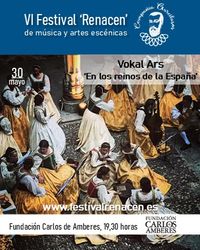 Vokal Ars. 'En los reinos de la España' VokalArs es una agrupación profesional integrada exclusivamente por mujeres. Su labor ha sido merecedora de galardones nacionales e internacionales y aborda proyectos artísticos con rigor y excelencia. VokalArs cuenta con un gran potencial para el desarrollo de proyectos musicales y cuida sus propuesta con especial esmero abordando diferentes dimensiones artísticas que engloban tanto escena como literatura y, por supuesto, una exquisita apuesta musical. En esta ocasión la agrupación se adentra en el Siglo de Oro como inspiración para su espectáculo. Nuria Fernández, su directora, es doctora en Humanidades por la Universidad Carlos III de Madrid, en la que, además, desarrolla diferentes proyectos corales que se han convertido en referentes dentro del panorama coral español: el Coro de la Universidad, el Programa Infantil de Música Escénica (1999-2008) y el Curso de Dirección de Coro que cuenta con más de 18 ediciones. ¿Cómo era la España de hace 500 años, qué pensaban los villanos de su vida cotidiana, cómo era el ocio de los nobles, sirve de algo mirar y cantar el pasado ahora, cómo era la fiesta del pueblo llano? | |
