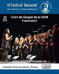 Coro de Gospel de la UCM. 'Espirituales' El Coro de Gospel y Música Moderna de la Universidad Complutense de Madrid está formado por un grupo de entre 35 y 40 cantantes y una banda estable de piano, bajo y batería, ampliada en ocasiones con guitarra y metales bajo la dirección de Idoris Duarte. Sus integrantes son tanto alumnos de la Universidad como antiguos alumnos y gente no relacionada con la universidad. Programa (Dirección: Idoris Duarte): Jesus Promised-Tim Carpenter; Wade in the Water- (Espiritual) Arr. Mark Hayes; With my Whole Heart- Nolan Williams Jr.; Go, Tell it on the Mountain- (Espiritual) Arr. Greg Jasperse | |