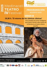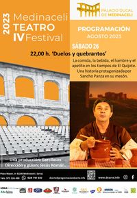 La Fundación DeArte organiza un año más su temporada cultural a la que incorpora música, lírica, artes escénicas... en esta ocasión, el Festival de Teatro tendrá lugar durante los días 25, 26 y 27 de agosto en la sede habitual del Palacio Ducal de Medinaceli. Nuestra compañía, junto con los socios de Escarramán Teatro, tendrán el placer de hacer llegar al público asiduo del Festival de verano de Medinaceli dos de sus producciones más señaladas: Sábado, 26 de agosto a las 19.30 horas.
