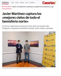 El fotógrafo Javier Martínez Morán plasma su amor por el cielo del archipiélago en 25 obras paisajísticas que se exhiben en la sede de la Fundación La Caja de Canarias hasta el 23 de abril Con la paciencia de un pescador de paisajes, el arquitecto y fotógrafo Javier Martínez Morán ha desplegado todos sus aparejos a escasos kilómetros del Roque Nublo en un atardecer de verano en la isla de Gran Canaria. El sol comienza a ponerse iluminando los roques, las cumbres y los pinares de la tempestad petrificada de la geografía insular, cuando de pronto los estertores del día regala un último cañonazo de luz en un espectáculo que precede al verdadero protagonista de la exposición: la noche. “Una vez se ha puesto el sol y todo está oscuro es cuando, gracias a las cámaras, se pueden ver las cosas como nunca antes las habías visto: las strellas, la Vía áctea, los colores de la noche…todo un festival de sensaciones esperando a ser descubierto”, afirma Martínez Morán, autor de las 25 obras que componen la exposición fotográfica que la Fundación La Caja de Canarias inaugura en el Centro Cultural CICCA y que se puede visitar hasta el 23 de abril de 2021. Desde la Fundación se señaló que esta exposición cumple con varios objetivos de la entidad como son el visibilizar artistas jóvenes y poner en valor uno de nuestros mayores atractivos naturales como la calidad lumínica del cielo del Archipiélago y su potencial en campos como los del astroturismo y la fotografía artística. El arquitecto y fotógrafo Martínez Morán fue contundente al respecto.“Canarias tiene uno de los mejores cielos del hemisferio norte para la observación de las estrellas”, apuntó antes de añadir que la combinación con el atractivo de los paisajes canarios lo convierten en escenarios únicos. Además, acostumbrado a largas esperas y noches sin premio, destacó que “aquí siempre tienes una oportunidad de hacer una gran foto. Hay muchas posibilidades en muy poco espacio”. Con esta propuesta, el artista madrileño asegura cumplir con un compromiso de su infancia. “Viví aquí durante varios años por temas laborales de mis padres y siendo un niño me fascinó completamente el paisaje de las Islas, por lo que nació en mí esta pasión por los paisajes y la fotografía. Me marcó”, explicó un fotógrafo que es autor del libro “Astrofotografía: el paisaje nocturno”, editado por Photoclub ANAYA, siendo uno de los libros más vendidos de fotografía de 2020. Sus obras han alcanzado notoriedad internacional, con ejemplos como el ‘Gold y Silver medals’ y ‘top 50’ en los premios Epson Pano 2018; e incluso una de sus creaciones fue elegida por la Nasa como foto astronómica del día. “Me fascina poder captar con la cámara aquello que es invisible a simple vista cómo los colores de la noche y el movimiento de las estrellas, el poder de los grandes paisajes y la inmensidad de las constelaciones y la vía láctea”. De esta manera Javier Martínez Morán recorre el archipiélago para mostrar la belleza de parajes como los de Acusa Verde, el Pico de Las Nieves, la Ventana de La Gañifa, el Roque Nuble con el Teide de fondo, La Pared de Fuerteventura, El Pris o el mirador de Ayosa en Tenerife, el parque de Garajonay o las Salinas de Fuencaliente,entre otros lugares emblemáticos. Jesús Román comisario de la exposición y gerente de la Compañía Garcilasos, destacó la trayectoria del artista y que varias de obras de la muestra han recibido premios y distinciones en premios de fotografía como el que reúne a los parques nacionales de España. | |